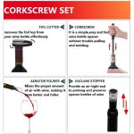 Questo set 4-in-1 include un apribottiglie a pompa d’aria, un tagliacapsule, un aeratore versatore e un tappo sottovuoto per un’esperienza del vino impeccabile.